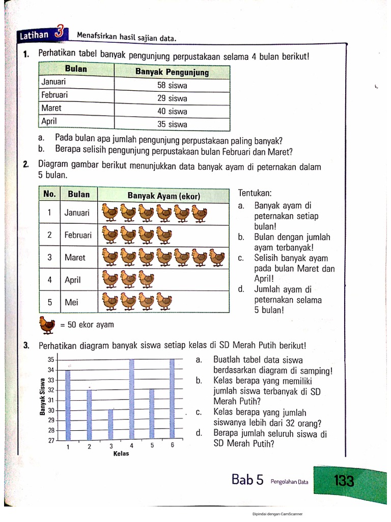 Berikut ialah data buah kesukaan siswa kelas v. Buku siswa merupakan buku panduan sekaligus buku aktivitas yang akan memudahkan para siswa terlibat aktif dalam pembelajaran. Jumlah siswa yang memilih musik = (musik/360°) x jumlah total siswa = (50°/360°) x 1260 siswa = 63000/360 = 175 siswa jadi ada 175 siswa yang melakukan musik ekstrakurikuler. Membaca grafik lingkaran membuka modal diagram batang dan daun. H) dari data tabel diatas, buatlah diagram batang, diagram garis dan diagram lingkran.